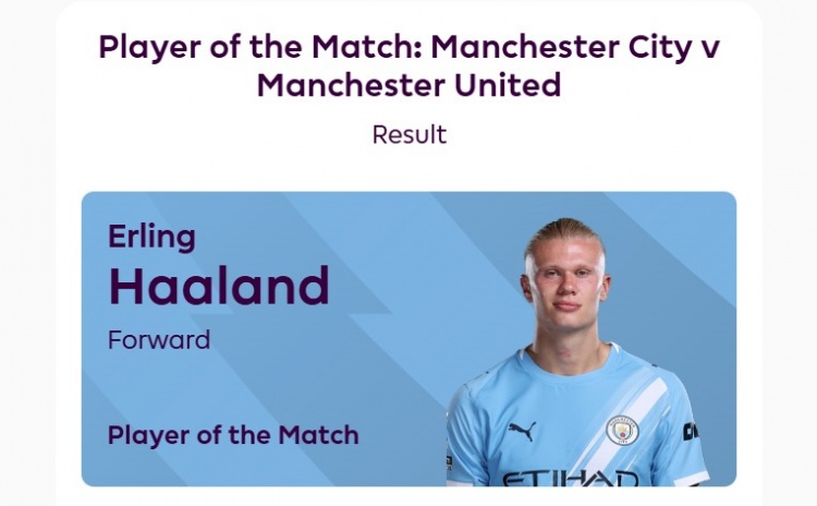 哈兰德当选此役全场最佳球员,获得82%的投票。