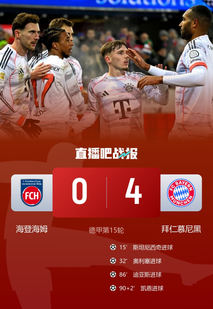 拜仁4-0海登海姆,9分领跑年度收官。本场斯坦尼西奇、奥利塞、迪亚斯和凯恩破门。