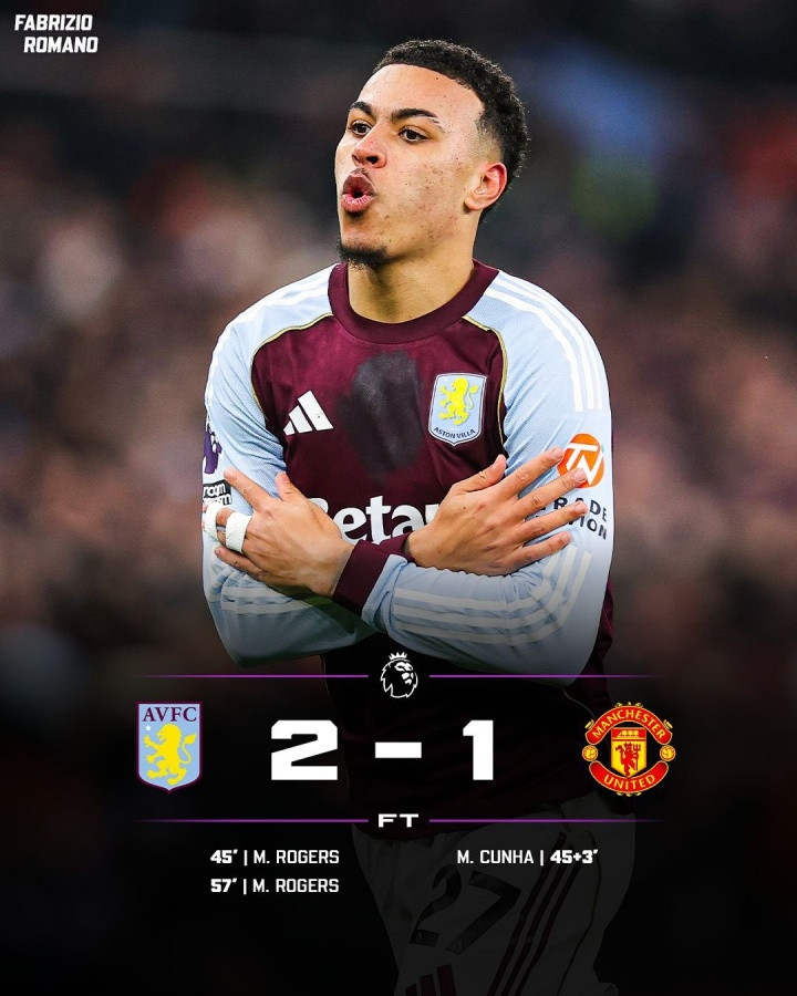 4轮仅1胜!曼联1-2维拉罗杰斯双响库尼亚破门B费伤退维拉7连胜