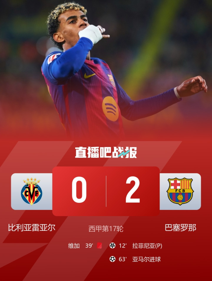 职业联赛 8连胜年度收官!巴萨2-0十人黄潜亚马尔破门+造直红拉菲点射
