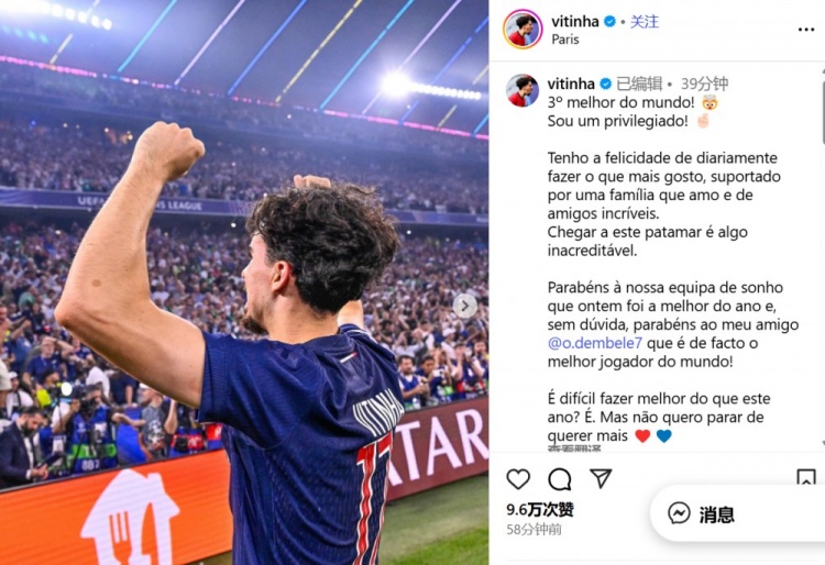 9月24日讯 在获得金球奖第三名后,巴黎中场球员维蒂尼亚更新了社交媒体。