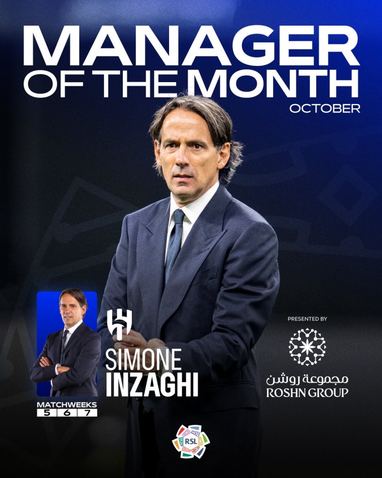 11月5日讯 本周三,沙特职业联赛 官方宣布利雅得新月主帅西蒙尼-因扎吉当选10月份的最佳指导教练员。