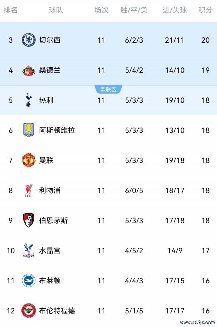 11月10日讯 英超11轮赛事 结束,在积分榜上,中上游球队角逐 剧烈 ,从第3名的切尔西到第12名的布伦特福德,分差仅有4分。