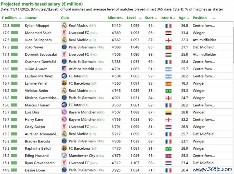 值得注意的是,这个数字比他实际收到的金额低40%。这主要是因为皇马在2024年夏天签下他时没有支付转会费,以及超级明星效应使顶级球员能够通过其地位获得更多收入。萨拉赫和贝林厄姆分别位列第二和第三。
