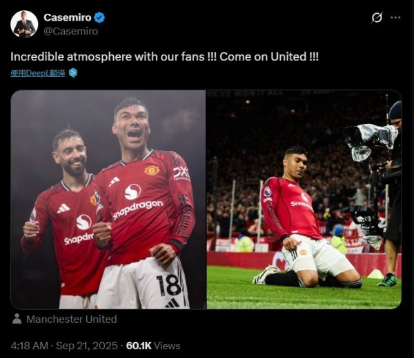 英超在线直播免费直播 9月21日讯 本轮英超焦点战,曼联2-1战胜切尔西。赛后,此役染红的卡塞米罗发文庆祝获胜 。 卡塞米罗晒出自己的赛场照英超在线直播免费直播 ...