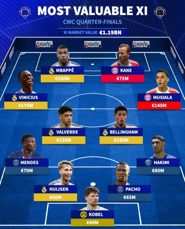 苏超热度不减新 7月4日讯 世俱杯很快将迎来八强对阵,《转会市场》也统计了八强最贵阵,下半区四队包揽。 德转列世俱杯八强最贵阵:总身价11.9亿欧元 前场球员: ...